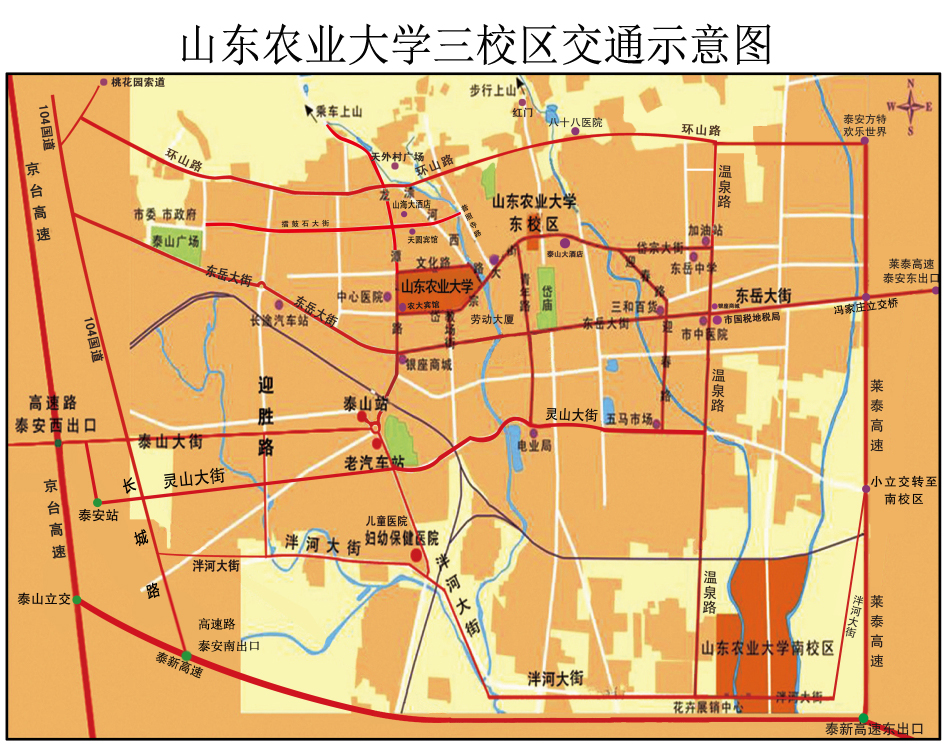 从泰安东高速出口进入泰安市区可直接从东岳大街到岱宗大街西行至星空电竞app下载官网东校区或北校区;从从东岳大街至温泉路南行至星空电竞app下载官网南校区;